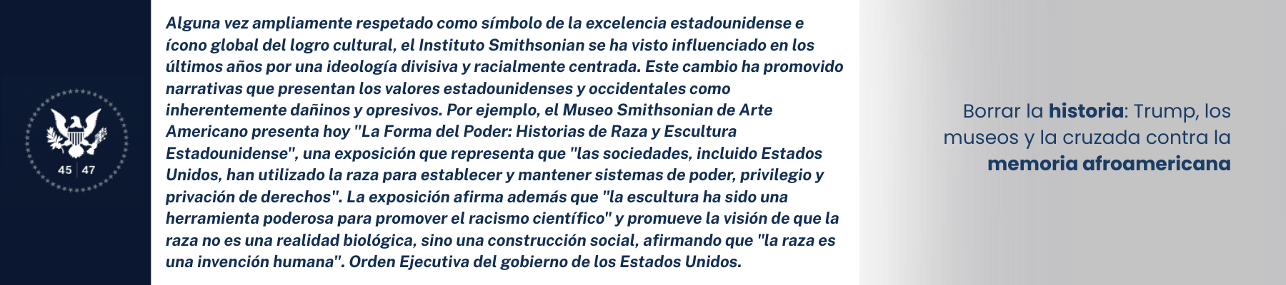 La orden apunta directamente al Smithsonian, el complejo de museos más emblemático del país. Trump acusa a la institución de promover una “ideología divisiva y centrada en la raza”, y exige que se prohíba el gasto en exposiciones que “dividan a los estadounidenses por motivos raciales”. El blanco más evidente es el Museo Nacional de Historia y Cultura Afroamericana, inaugurado en 2016, pero también se han cancelado exposiciones con enfoque de diversidad en otras instituciones culturales (El Espectador).